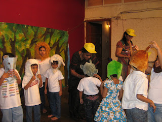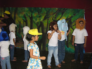 The programme was held at the Navi Mumbai Kannada Sangha Hall in sector 9A, Vashi. We used two home-made canvas backdrops, one showing a jungle scene and the other showing a water scene.
