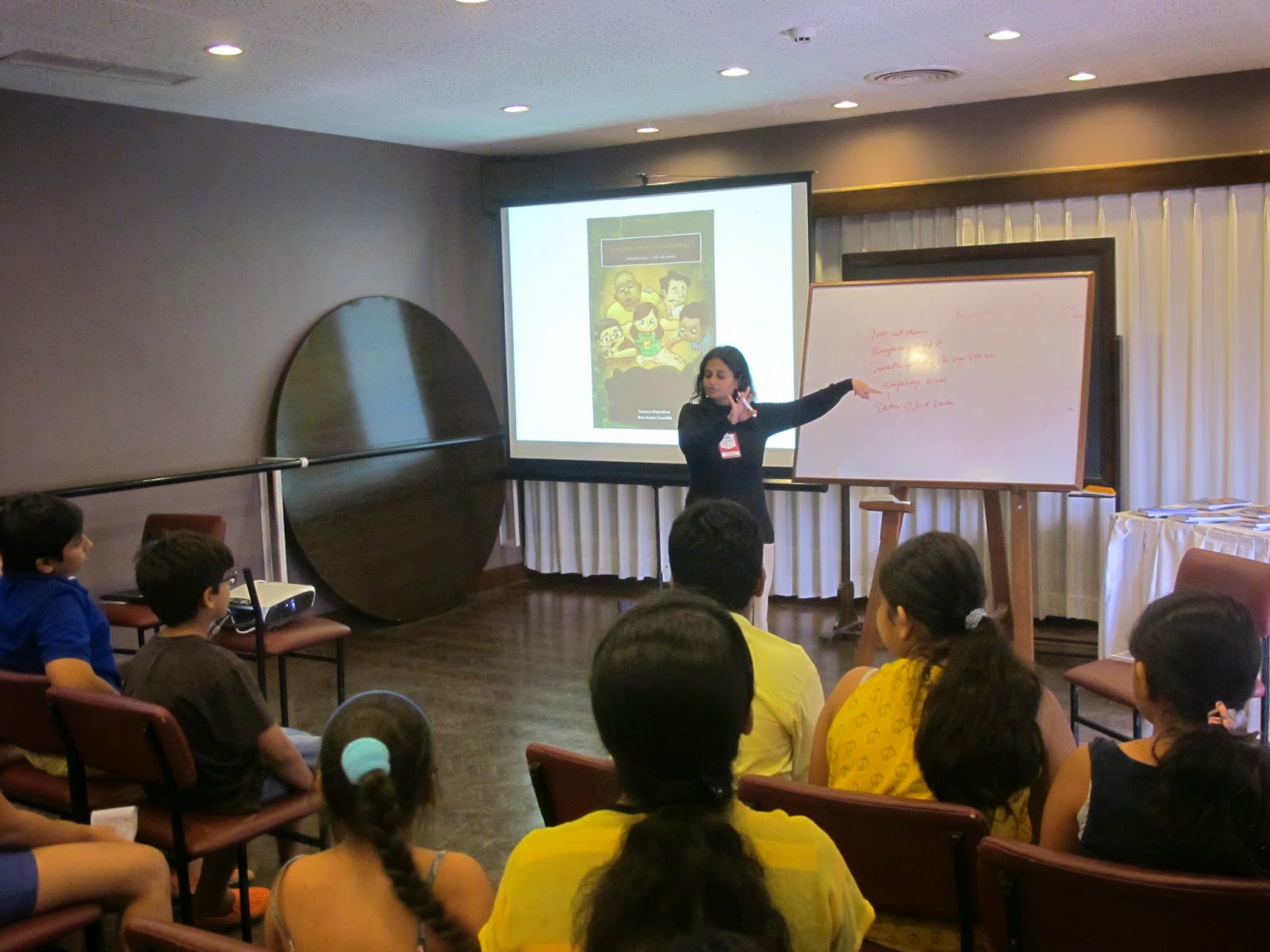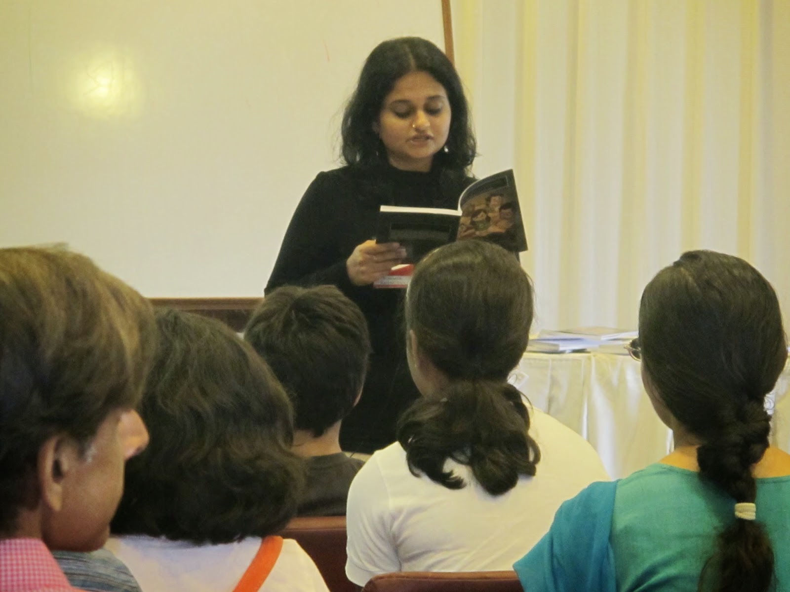 Chitra Soundar, the author of the Farmer Falgu series, visited Sankara School, Adyar earlier today, and entertained a large group of noisy kids with her Falgu stories. Here are some pictures from the event.