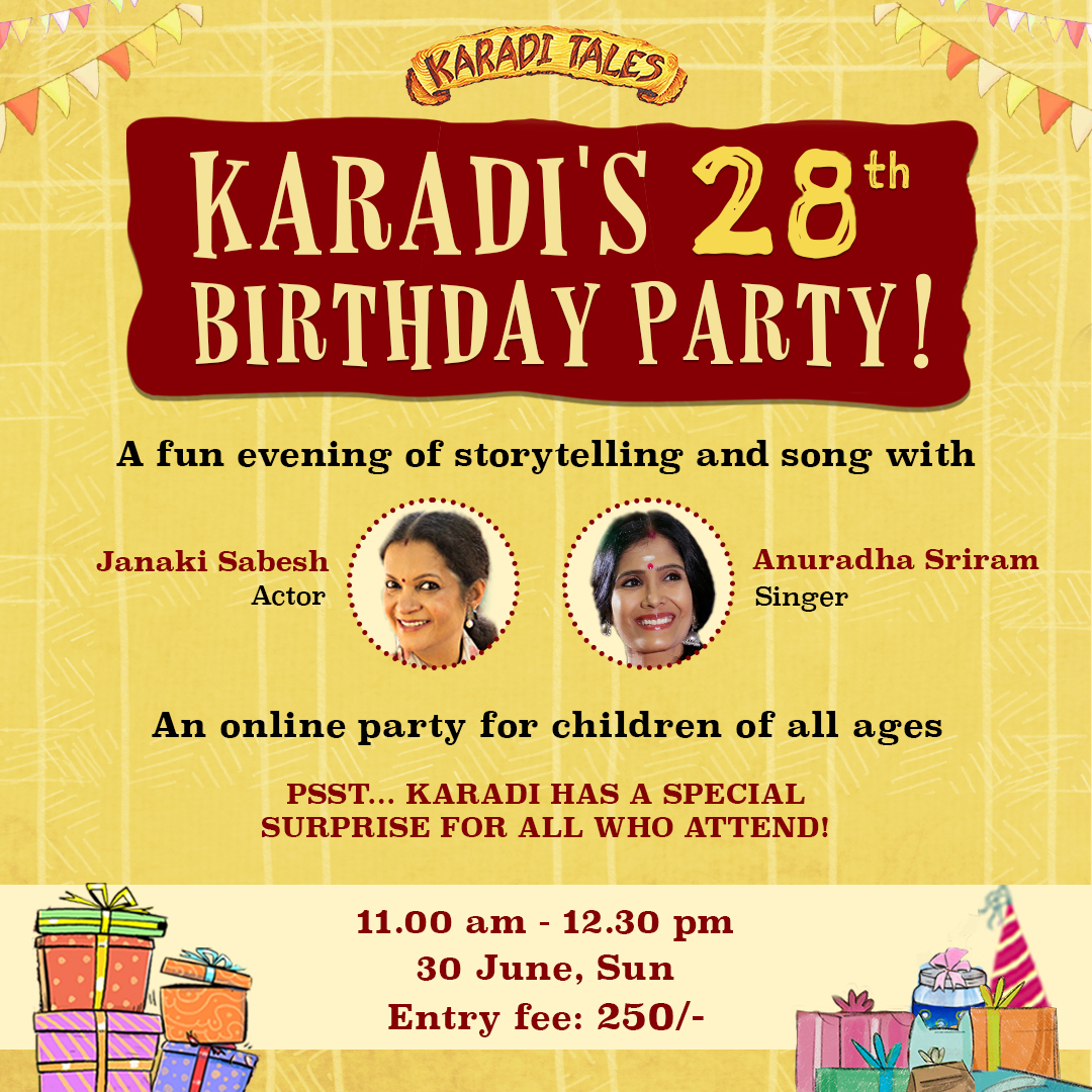 Karadi is turning 28, and he can't wait to celebrate with you. Mark your calendar for an unforgettable virtual birthday party packed with storytelling and song. Our guests for the evening, actor and storyteller Janaki Sabesh and singer Anuradha Sriram, are ready to take you on a journey through Karadi's classic stories and rhymes. Come join them for an evening that will have you moving and grooving. And that's not all - Karadi has a fantastic surprise planned just for you!
