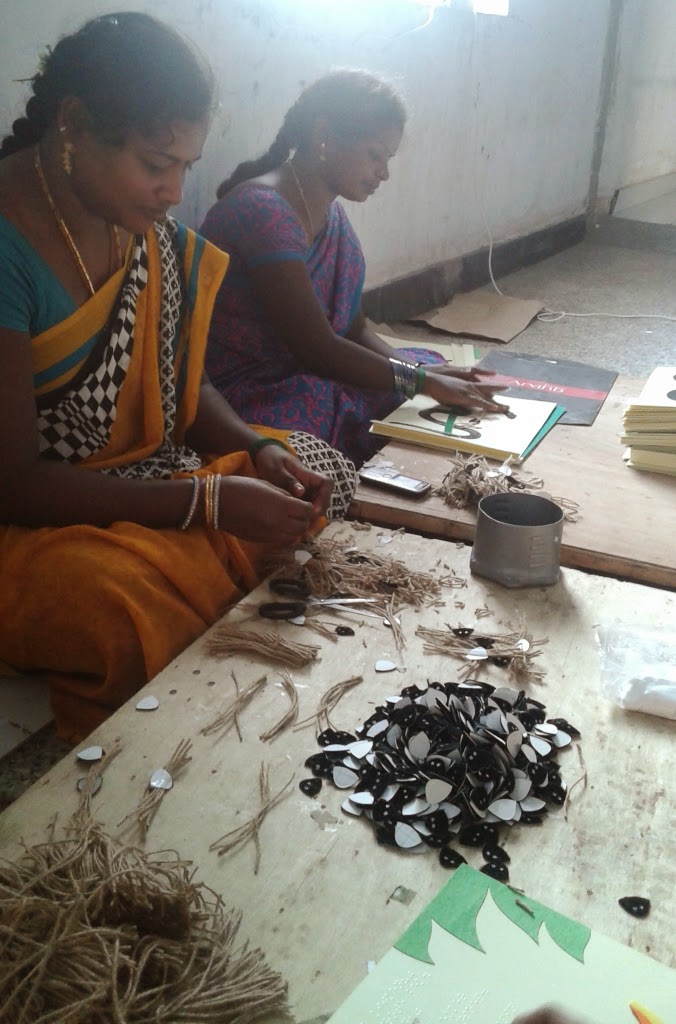 We have been working on an exciting project over the past couple of months – a tactile book for our publisher friends from Lemniscaat, Netherlands. Titled ‘Feestmaal Voor De Koning’ (The Feast for the King), this book tells the story of a chef – a tarantula – who goes around investigating all the animals in the kingdom regarding their king’s missing birthday treat. We made tactile books out of this delightful story and sent them to Lemniscaat last week, and this would not have been possible without Rajendran and all these lovely ladies at V and M Prints.